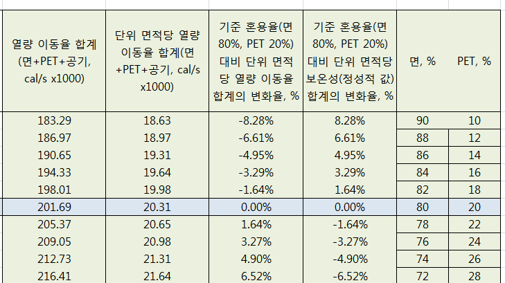´ÙÀ½ Ç¥´Â ¸é 80%, PET 20%ÀÇ º¸¿Â¼ºÀ» ±âÁØÀ¸·Î ÇÏ¿© ¸é°ú PETÀÇ